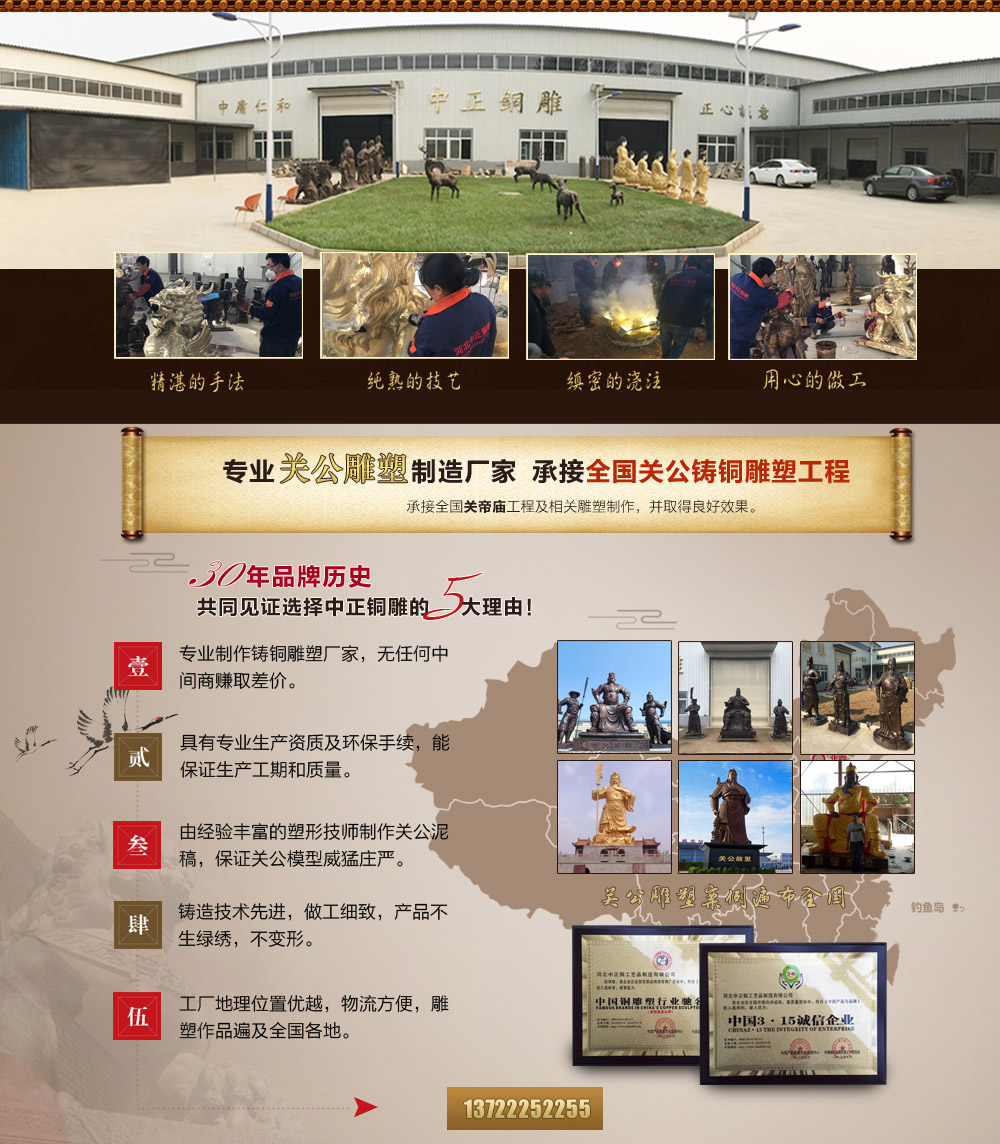 河北中正銅工藝品制造有限公司是一家具有獨立設計、雕塑、鑄造、制作施工能力的單位。擁有完善的,大型的,先進的生產(chǎn)設備,并由多位經(jīng)驗豐富的高級鑄造技師指導生產(chǎn)及制作。公司主要鑄造銅關公,九龍銅關公,福建銅關公,臺灣銅關公,關羽雕塑,鑄銅關公,銅雕關公,1米銅關公,2米銅關公等,可按客戶提供動物銅雕圖片訂做加工銅關公,九龍銅關公,做工精美,質(zhì)量保證。